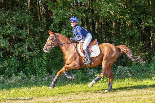 Alice begeleide Claire v Someren die bij ons traint en op stal staat. In de ochtend de cross gefietst, daarna met springen en met de cross geholpen. Haar Limitee schrok helaas een keer waardoor ze een weigering kreeg in de cross op hindernis 7. Alice heeft het jammer genoeg niet kunnen zien. Verder ging ze keurig rond en ze sprong ook een foutloos springparcours. Tijdens de dressuur was ze doorweekt van de regen waardoor ze het erg koud had. Dus dat kon beter. Ze werd 5e in de klasse M pony’s. Daniel Haver, die ook bij ons op stal staat en traint werd 7e.